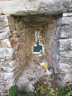 The modern and probably also original access to the castle is via a 2.7-metre-wide round arch portal in the southern wall, directly east of the keep. On the side walls of this portal there are two holes, one above the other, between 0.6 and 0.9 meters deep with a side length of around 20 centimetres. They may have originally provided space for the sliding beams or the brackets of a castle gate. On the western inside of this portal there is another roughly square-shaped opening with a side length of around 25 centimetres, which is around 2.1 meters deep and extends into the masonry of the keep. To the east of the portal are three embrasures which, at least in more recent times, are deeper than the entrance to the castle. It is possible that the building complex originally had a different ground level or that a staircase or ramp led up to the portal. The terrain on the outside of the portal was originally steep and rocky and was leveled in the 20th century to make access easier. Some castle researchers therefore assume that a wooden bridge led to the portal during its original period of use. The absence of the original east wall, which was only rebuilt in the 20th century, also suggests an entrance on this side. In his description of the castle from 1925, Anton Mell mentioned a 35-centimetre-wide plastered channel that has not survived. canal. This led from the embrasure to the east of the portal up to the wall, but also branched off to the portal itself, and Mell assumed that it was a kind of mouthpiece for the castle garrison.[49] The three windows in the wall above the entrance portal are probably not original, even if the wall here is otherwise quite well preserved in its original state.[50]