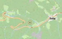 The castle is located in the north-western part of the market town of Maria Lankowitz, in the western part of the cadastral municipality of Salla. It lies around 900 meters west-southwest of the village of Salla on a narrow, wooded mountain ridge that slopes steeply to the north, east and south and is particularly rocky to the south. This is the last spur of a ridge branching off to the southeast and bending to the east from the Ofnerkogel, a peak in the Stubalpe mountain range, which rises around 150 meters above the Sallabach valley. It is bordered to the south by the Sallabach stream and to the north and east by the Lederwinkelbach stream.[2]