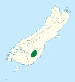 | Distribution of Oligosoma burganae on a map of the South Island Known native range