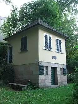 Directly east of the Burgberg garden, the imperial postmaster Ruprecht Wels established a terraced restaurant and amusement park, the so-called Welsgarten, in 1770. The Erlangen Burschenschaft was founded there on 1 December 1817.[12] A commemorative plaque on the lowest terrace wall commemorates this event. The garden was parcelled out at the beginning of the 20th century and built with villas. One of these villas is now the seat of the Erlangen Music Institute. Even today, the castle hill is still the first address of the city and is built with villas and spacious single-family houses.