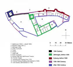 After the extinction of Zähringen line, Burgdorf passed to the Counts of Kyburg. Under the Kyburg or Neu-Kyburg Counts, Burgdorf Castle was the capital of the county, and the counts were the mayors of Burgdorf town. Under the Kyburgs, additional fortifications were added to the castle. The northern curtain wall was extended and two half-round towers were added. The eastern end and the western hall were built up and expanded.[3] When the Kyburg line died out in 1264, the castle passed to Eberhard of Habsburg, who was married to Anna of Kyburg. Eberhard then became the Count of Neu-Kyburg.