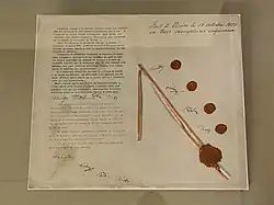 On 27 July 1989, the foreign ministers of Austria and Hungary, Alois Mock and Gyula Horn, cut the Iron Curtain in the village of Klingenbach in a symbolic act with far-reaching consequences.[11] At the same time, the border crossing at Nickelsdorf (Austria) / Hegyeshalom (Hungary) was opened by the Hungarian border patrol and this enabled the escape of East Germans. Directly behind the wires special medic troops of the Austrian Red Cross awaited them and provided first assistance. Thousands of East Germans fled to the West in this way. Again, the inhabitants of Burgenland received them with great hospitality. Later, this was often referred to as the beginning of German reunification.