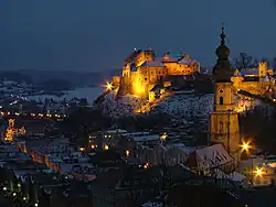 Burghausen is the largest town in the Altötting district of Upper Bavaria in Germany. It is situated on the Salzach river, near the border with Austria. Burghausen Castle rests along a ridgeline, and is the longest castle in the world (1,051 m).[3]