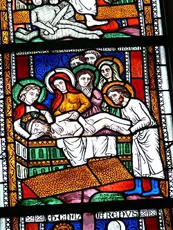 The burial of Jesus refers to the entombment of the body of Jesus after his crucifixion before the eve of the sabbath. This event is described in the New Testament. According to the canonical gospel narratives, he was placed in a tomb by a councillor of the Sanhedrin named Joseph of Arimathea;[2] according to Acts 13:28–29, he was laid in a tomb by "the council as a whole".[3] In art, it is often called the Entombment of Christ.