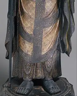 The statue, carved from hinoki , is joined with a technique known as yosegi-zukuri (or multiple blocks), with a hollow interior, where the crystal eyes are inlaid. The Burke Jizō utilizes a signature style of Kaikei, which is that of a naturalistic model of the body, along with cut-gold patterning of the robes (kirikane ). His right hand would hold a staff, the khakkhara and a jewel on the left hand (hōju no tama ).[ 2] [ 12]
