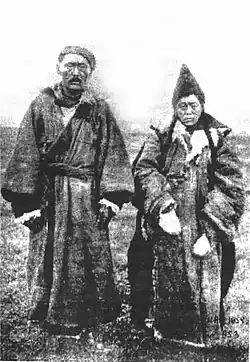In April 1904 Chet Chelpan (or, Chot Chelpanov) and his adopted daughter Chugul Sarok Chandyk reported visions of a rider dressed in white, and riding a white horse. This figure, whom they called Ak-Burkhan ("White Burkhan"), announced the imminent arrival of the mythical messianic hero Oirat Khan who was actually a real historical figure—Khoit-Oirat prince Amursana.[8] The central figure in the research of Burkhanism in the past forty years, however, has demonstrated that Oirot-khan is a mythologized image of the Dzungar past of the people of Altai-kizhi.[9][10] Chet and Chugul gathered thousands of Altaians for prayer meetings, initially in the Tereng Valley. These were violently suppressed by mobs of Russians, instigated by the Altaian Spiritual Mission, who were afraid of the potential of the competing religion to decrease the Orthodox Christian flock in Altai.[11] Chet and Chugul were arrested, Chugul was released, and after a prolonged trial Chet was fully exonerated by court and released in 1906.[12]