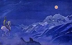 Russian painter Nicholas Roerich and his wife Helena Roerich passed through Altai in 1926. Nicholas painted Oirat—Messenger of the White Burkhan based on his understanding of the movement. (Note that the painting's title apparently gets the theology backward—it was rather White Burkhan who was the messenger for Oirat.) Followers of Agni Yoga, an esoteric movement founded by the Roerichs, have encouraged a recent revival of interest in Burkhanism among non-Altaians. At the same time they have insisted on a link with Tibetan Buddhism and a veneration of Mount Belukha, elements not found in traditional Burkhanism.