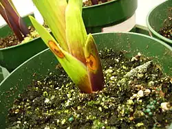 Some other common symptoms of infected plants can be seen in the leaves. The leaves contain brown lesions, and they may become watersoaked. Other symptoms are the wilting and/or rot of roots, stems, and petals. B. gladioli has also been identified as the causative agent in leaf-sheath browning in gladiolas and onions. Sometimes, the whole plant decays.[2]