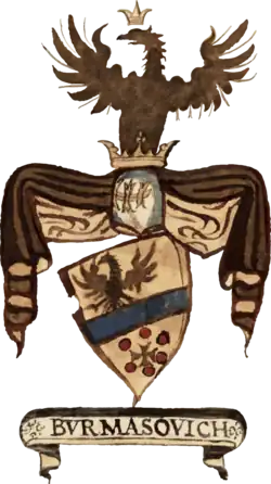 ![]() Coat of arms of the Burmazi Family, as depicted in the "Insignia procerum Bosnae, Croatiae, Illyriae, &c, quorum alter liber unicus asservatur penes Ragusii rempublicam (p. 28)", published in 1700. | |