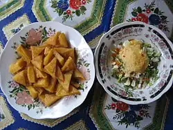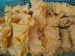 Burmese tofu (Burmese: တိုဖူး, pronounced [tòpʰú]; or Burmese: တိုဟူး, pronounced [tòhú]) is a food of Shan origin and of Chinese from Yunnan Province, made from water and flour ground from yellow split peas and the Burmese version of chickpea flour, also known as besan flour, in a fashion similar to polenta.[1] The flour is mixed with water, turmeric, and a little salt and heated, stirring constantly, until it reaches a creamy consistency. It is then transferred into a tray and allowed to set. It can also be made using dried chickpea instead of processed flour. In this process, dried chickpeas are soaked overnight. Once the peas have been re-hydrated, they are ground into a puree with some of the liquid used to soak the peas, then allowed to set for a couple of hours. Much of the top layer of clear liquid is then skimmed off and the remaining puree is brought to a boil with turmeric and salt and cooked and set in the same manner as the version using chickpea flour. It is matte yellow in colour, jelly-like but firm in consistency, and does not crumble when cut or sliced. It may be eaten fresh as a Burmese tofu salad or deep-fried into a Burmese fritter.[2] It may also be sliced and dried to make crackers for deep frying. Despite the name, Burmese tofu is unrelated to Chinese tofu,[3] which is made from soy milk with added coagulants.