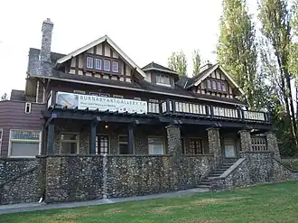 The Burnaby Art Gallery is located in Fairacres Mansion,[4] which was designed by Robert Percival Sterling Twizell[5] (1875-1964).[6] Fairacres Mansion, also called Ceperley House, for its original owners, was built in 1910 at an estimated cost of C$150,000.00, making it the largest and most expensive house in Burnaby, British Columbia of its time.[7] It was constructed in the Edwardian Arts and Crafts style with handmade fixtures, carpentry and tiled fireplaces. The original grounds included a garage and horse stables, an aviary, gazebo and pergola, lagoons, strawberry fields, greenhouses, a steam plant and a gardener's cottage.[8] The tiles throughout the house were imported from England, fabricated by Conrad Dressler and his Medmenham Pottery. In the former billiards room and parlour, a grand oak mantelpiece, hand-carved by George Selkirk Gibson, bears a quote by Ralph Waldo Emerson: "The ornament of a house is the friends who frequent it."[9] On the death of the original owner Grace Ceperley, the house was sold to a series of private owners. In 1939, it was acquired by Benedictine monks, and became an Abbey in 1953.[10] The Order vacated the house in 1954 when it moved to Westminster Abbey (British Columbia) in Mission. After the Benedictines sold the property, it was used by the Canadian Temple of the More Abundant Life and as a fraternity house for Simon Fraser University's Delta Upsilon fraternity.[11] In 1966, the Burnaby Art Society, led by Jack Hardman, Polly Svangtun, Sheila Kincaid and Winifred Denny, among others, worked with the City of Burnaby to purchase the 3.4 hectares (8.4 acres) site for C$166,000.00. The Burnaby Art Gallery opened its doors on June 10, 1967.[12]