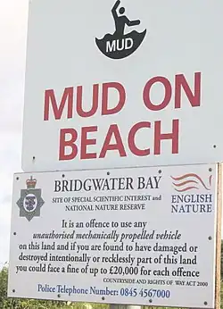Burnham-on-Sea is on the shore of the Bristol Channel and has a long sandy beach, but nearby mudflats and sandbanks have claimed several lives over the years. At low tide, large parts of the area become mudflats up to 4 km (2.5 miles) wide due to the tidal range of 15 metres (49 ft),[1] second only to the Bay of Fundy in Eastern Canada.[2][3]