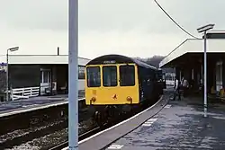 However, the cutbacks of the 1960s affected the station badly, with through trains to Manchester via Bury ending in 1964 (two years before the withdrawal of the Accrington to Bury service) and those to Liverpool in 1969 whilst the line to Skipton was closed to all traffic in 1970.[4] This left the station on a 6+1⁄2 miles (10.5 km)-long dead-end branch line from Rose Grove to Colne, although the line remained double as far as Nelson until December 1986. The eastbound line and platform, used by trains towards Colne, was taken out of use thereafter and the station signal box closed; the track was subsequently lifted and the box and platform demolished a few years later. Only part of the remaining (former westbound) platform is now used by passenger trains; the rest is fenced off and overgrown. Immediately to the west, the line passes above the centre of the town on Bank Top viaduct as it heads towards Gannow Junction.