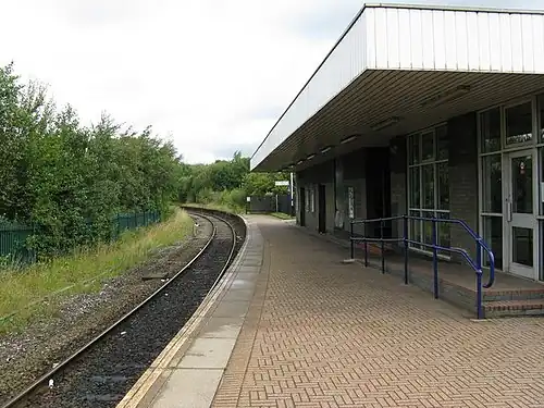Despite the cutbacks, the station was rebuilt in 1965. Its ground floor is at street level and the first floor at platform level. It provides a booking hall, toilets, waiting rooms, stationmaster's office, parcels office and left luggage office.[5]