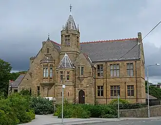 The school seems to have been in decline in second half of the 19th century, even as the town rapidly expanded around it. An education commissioner's report from the late 1860s showed attendance to be low and the schoolhouse in a poor state. Wealthy families shunned the school in favour of distant boarding schools, and several attempts to raise funds for a new building failed.[5] During 1871 the Governors of the school agreed to allow representatives of the Town Council and School Board to join them, in return for financial aid. This resulted in the 1874 opening of new school buildings across Bank Parade (53°47′35″N 2°14′28″W / 53.793°N 2.241°W),[6] which can still be seen today.[7] Despite an agreement at this time to establish a girls department once funding could be established, no action was taken. By the late 1890s, it looked like the school board would create a rival higher grade school,[8] which would likely be disastrous for the grammar school. Some girls were allowed to attend from 1903 and it was taken over entirely by the council in 1904. It was decided that an equivalent girls' school should be created and Burnley High School for Girls opened in Ormerod Road in 1909 (53°47′35″N 2°14′17″W / 53.793°N 2.238°W).[9] It moved to a new building in the former grounds of Ivy Bank House in the 1951 (53°47′38″N 2°17′17″W / 53.794°N 2.288°W).[10] In 1959 the grammar school moved once again to larger premises on Byron Street (53°47′42″N 2°17′35″W / 53.795°N 2.293°W), next to the girls' school,[1] with Ivy Bank Secondary Modern School also constructed on the site in the 1960s.