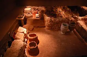 Among the smaller artefacts found were inkwells, Roman-period oil lamps that were used to light up the house during the evenings, and other household items, the large jugs, bowls and measuring cups, indicating that this was a perfume production workshop.[6] Leaning against a corner of a room was an iron spear, which may have belonged to one of the Jewish fighters who lived here.[7]