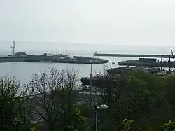 Burntisland developed as a seaport, being second only to Leith in the Firth of Forth, and shipbuilding became an important industry in the town. James V improved the harbour in 1540 and named it "Our Lady Port". In 1544 it was defended by three artillery blockhouses.[13] An English report mentions a dock at Burntisland called the Newhaven and says a pier and the three blockhouses were to the west, at "Mill Dame".[14] During the war of the Rough Wooing in 1548 the English commander Edward Clinton planned to reconstruct the harbour and pier and their defences, employing a military engineer. In 1559, the town came under French occupation when Scottish Protestant leaders opposed the Catholic Mary of Guise. The occupation ended with the arrival of an English fleet in 1560, prompting the occupiers to retreat by land, back to Leith.[15] The harbour at this time was dry at low-tide and ships lay in the "ooze" or mud.[16]