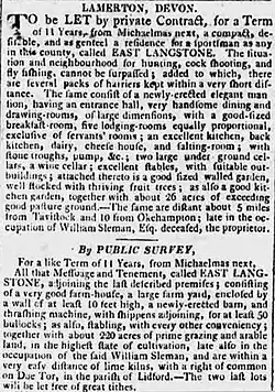 The map of Brentor of 1809 shows that the Burnville Estate was then called East Langstone (or Longstone). At this time it was owned by William Sleman (1780-1814) who possibly built the house. In 1802 he married Agnes Cundy (1776-1831) who was also from the parish of Lamerton and the couple had three children. Unfortunately William died in 1814. The death notice is given at this reference.[3] In the same year the house and the nearby farm were advertised separately as rental properties. The notice is shown. The house is described in the following terms.
