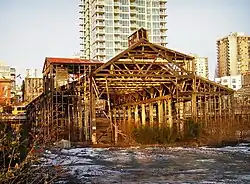 - 2000 – Real estate developer Pinnacle International creates a plan for the site involving multiple condo towers, hotel, commercial space and public amenities. Three of the former shipyard buildings, two shipyard cranes and the stern and steam engines from the former HMS Flamborough Head (HMCS Cape Breton), which was built here in 1944, are to be preserved as part of the development.