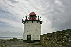 Burry Port Lighthouse is a harbour light with a reflector, and is situated on the west breakwater of the outer harbour.[2][3] It was built in 1842 and was erected with the permission of Trinity House and maintained at the joint expense of the proprietors of Burry Port Harbour and the Commissioners of the Burry Navigation.[3] The light consists of a 24 ft white painted, stone, circular tower with a black gallery and red lantern.[2] As this was a harbour light, the annual cost of its upkeep, which cost £32 in 1844, was not met by a direct charge to shipping. However, in 1845 the superintendent of Burry Port Harbour reported that buoyage dues not exceeding 1d a ton had been regularly charged since the passing of an Act for the ‘Improvement of the Navigation of the Rivers Bury, Loughor and Lliedi’ on 2 July 1813.[3]