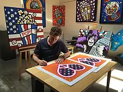 Burton Morris (born 1964) is an American pop artist. Best known for his bold, graphic pop art paintings and depictions of various modern icons, his subject matter includes everyday objects that portray today's popular culture. His distinctive style is characterized by radiant outlines and vivid colours in all of his art.