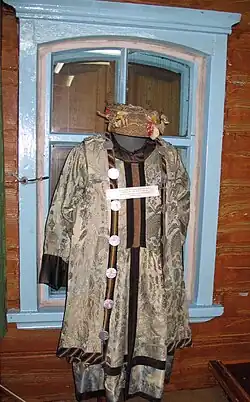 Marriage was arranged by the family, at times occurring as early as one to two years old.[34] A unique aspect of traditional Buryat marriage was the kalym, an exchange that combined both bride wealth and a dowry.[34] Kalym involved a husband exchanging an agreed number of head of cattle for his bride, while the bride's family would provide dowry in the form of a yurt and other essential household goods.[34] If a husband did not have enough cattle, a period of bride service would be arranged. Polygamy was permitted, however only men of extreme wealth could afford the price of multiple wives. Marriage ceremonies involved rituals such as the bride stoking the fire in the grooms tent with three pieces of fat, and sprinkling fat upon the clothing of the groom's father.[7]