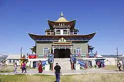 Religion today in the Republic of Buryatia is primarily divided between Russian Orthodoxy, Buddhism, and irreligious.[36] Shamanism has undergone a revival in rural areas, however it is still small. Those involved practise either Yellow shamanism, Black shamanism, or a mixture of the two.[37] Similarly, Buddhism has seen a revival among the Buryats. Construction of monasteries, training of monks, and the increasing piety of the Buryats has seen growth.[38]