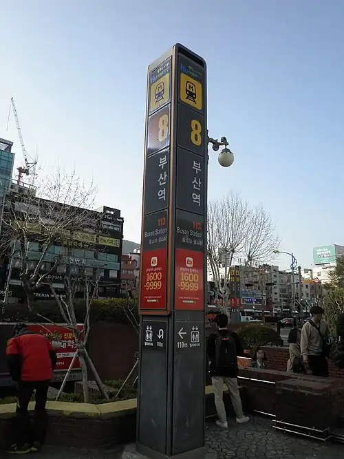 Busan station (Korean: 부산역) is a train station in Busan, South Korea. It is the southern terminus of the Gyeongbu Line & the Gyeongbu high-speed railway, the most important railway lines in the country, which links Busan with Seoul in around two and a half hours on KTX, Korea's high-speed rail train.[1][2][3] There are also cheaper, slower rail alternatives to Seoul, including the Mugunghwa service, which takes over four hours. Essentially all trains to Seoul stop in a few settlements between the two cities. It is also an underground station on Busan Metro Line 1 between Jungang and Choryang stations. The station is centrally located in the Choryang-dong (neighborhood) of Dong-gu (ward) in Busan.