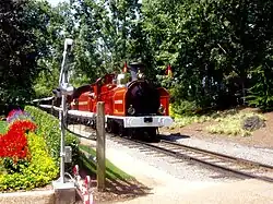 The Busch Gardens Railway is a 3 ft (914 mm) narrow-gauge amusement park heritage railroad attraction located within Busch Gardens Williamsburg amusement park in Williamsburg, Virginia. Opened in 1975, the railway is 1.5 miles (2.4 km) long, and has stations in the Heatherdowns, Festa Italia, and New France sections of the park. It features three trains pulled by 4-4-0 steam locomotives manufactured by Crown Metal Products.[1]