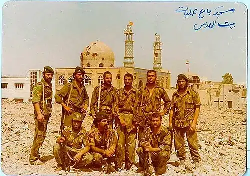 ![]() Memorial photo of Bushehr Marine Rangers Battalion with Khorramshahr Mosque behind after the Second Battle of Khorramshahr | |