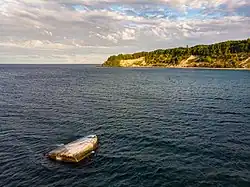 The Buskam (German pronunciation: [ˈbʊs.kam], locally [ˈbʊːskɒm]), also Buhskam or Buskamen is a large glacial erratic boulder, 325 metres off the coast of Göhren, Rügen, northern Germany.[1] Erratics (German: Findlinge) have been scattered all over northern Germany by the glaciers of the Ice Age, but are usually much smaller. The Buskam has a volume of about 600 m3, a circumference of about 40 metres, and weights about 1,600 tons.[1] A third of it (206 m3) lies above the water surface.