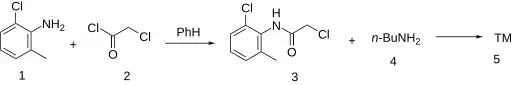 Amide formation by the combination of 2-chloro-6-methylaniline (1) and chloroacetyl chloride (2) gives the intermediate (3), which is used to alkylate N-butylamine (4) to yield butanilicaine.[1][2][3]