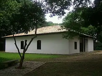 The Bandeirante's House is one of the memories of this time of the city's formation. It was originally located in lands known as Uvatantan, which in Tupi-Guarani language means "very hard land".[19] Today, it is known as Butantã Neighborhood. They belonged to the Portuguese Afonso Sardinha and his wife, who left the land as an inheritance to the Jesuits.[20] Afterwards, the house passed through several owners, none of them being Bandeirantes.[21] Even so, the house is called like this because in 1954, on the eve of the 400th anniversary celebrations of the city, they decided to give this name to the place as part of the festivities. The idea was to reproduce an authentic Bandeirantes site in the middle of the 20th century. Located near the banks of the Pinheiros River, it is a remnant of the colonial period buildings from São Paulo, known for the remarkable architecture of the time, with walls made of rammed earth and high ceilings. It is still located near the river, rectified in the 20th century. Originally the house was positioned on its bank, because water was the main transportation route, and living by the river was practical.