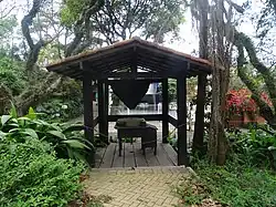 Outside,[18] there was a wall of wattle and daub all around the house, surrounding all the land nearby, except the river side. In this wall a wide wooden gate gave access to visitors. These old walls were built to defend the house from the indigenous that were in the vicinity. There are also two gardens next to the house: a larger one, with large trees, which had silk floss trees in front facing the Pinheiro River (old riverbed) with access through a gate; and a smaller one that was to the left of the entrance, for the private use of the residents, with flower cultivation, climbing plants and begonias. There was also a bed of medicinal plants. Near the exit to the Pinheiros riverbed, there is still today a maize milling used since the house was built.[5][23]