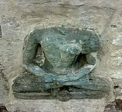 The in-situ seated Buddha (or Bodhisattva) statue at Butkara is considered one of the earliest, if not the earliest, known iconographical statues of the Buddha in northwestern India.[4] Van Lohuizen-de Leeuw considers that the statue dates to the late 1st century BCE to the early 1st century, as it was discovered in the GSt 3 stratum that contained a coins of Azes II.[4] More conservative estimates date it to the 1st-2nd century CE, roughly at the same time the first known statues of the Buddha were made in the art of Mathura.[4] Probably the earliest known statue of the Buddha in the art of Mathura is the "Isapur Buddha", dated to circa 15 CE.[5] This would make the creation of the Buddha image an approximately simultaneous phenomenon between the two geographical areas.[4]