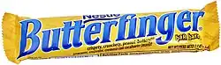 Butterfinger is a candy bar manufactured by the Ferrara Candy Company, a subsidiary of Ferrero. It is manufactured internationally by Nestlé.[1] It consists of a layered crisp peanut butter core covered in a "chocolatey" coating (it is not eligible to be referred to as chocolate, as it contains no cocoa butter).[2][3] It was invented by Otto Schnering of the Curtiss Candy Company in 1923. A popularity contest chose the name.