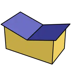 The form has no gutter as rainwater can run off the roof in no more than two locations, at either end of the valley, often into a scupper or downspout. The form may be symmetrical, with the valley located in the center, or asymmetrical with an off-center valley.[4] The valley itself may be flat, with a central roof cricket diverting water towards the valley ends, or sloping if the entire roof form is tilted towards one end of the valley.