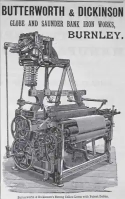 The Saunder Bank works was founded by Samuel Dickinson. It was inherited by his nephew William Banks from Tosside, Bolton-by-Bowland in 1871 and he went into partnership with John Butterworth, of "Oak Bank". The partnership operated the Saunder Bank works which it extended and took on the Globe Iron Works.[1] Around 1889, the company built new premises at Rosegrove. The company had interests in cotton manufacture at the Westgate Shed. William Dickinson was an active businessman who served as Mayor of Burnley.