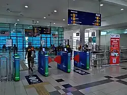 Station concourse above the platform area with the ticketing counter and the old wooden chairs which were previously used in the old Ipoh railway station. -