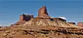 Buttes of the Cross is two sandstone summits located in the northern reach of Glen Canyon National Recreation Area, in Wayne County of Utah, United States.[3] The larger and higher south butte reaches an elevation of 5,642 feet (1,720 meters), whereas the north butte rises to 5,569 feet, with approximately 0.6 miles (0.97 km) separation between them.[2] When viewed from the north-northeast near Labyrinth Canyon, they align to form the shape of a cross, creating the appearance of a single butte. The name "Butte of the Cross" was first applied by John Wesley Powell during the Powell Geographic Expedition of 1869.[3] A few miles further down the Green River, Powell finds that this geographical feature is two buttes when viewed from the east, so it was renamed Buttes of the Cross.[4] Buttes of the Cross towers over 1,400 feet (430 meters) above its surrounding terrain. It is situated 6.8 miles west of Candlestick Tower, and one-half mile outside the boundary of Canyonlands National Park.