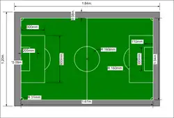 The game is played on a smooth, flat surface with markings per a regulation football field. Typical dimensions of the table would be 1.84 m long by 1.20 m wide, with the field being 1.67 m by 1.04 m. Goals are typically 12.5 cm wide by 5 cm tall per the interior dimensions.