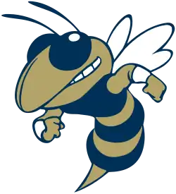 In 1979, McNair's idea for a Yellow Jacket was reintroduced by another Georgia Tech student, Richie Bland.[5] Bland, who was apparently unaware of McNair's prior initiative, paid $1,400 to have a local theme park costume designer make a yellow jacket costume that he first wore at a pep rally prior to the Tennessee football game.[5] Rather than obtain permission from Georgia Tech as Judi had done in 1972, this student, a few weeks later simply sneaked onto the field in costume during a football game and ran across the field.[5] The fans naturally believed that this costumed character was acting as an official member of the cheerleading squad and responded accordingly.[5] By 1980 this new incarnation of the yellow jacket mascot was given the name Buzz Bee and was adopted as an official mascot by Georgia Tech.[5] This new Buzz character would be the model for a new Georgia Tech emblem, designed in 1985 by Mike Lester.[11]