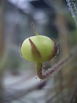 The plant's leaves are 2–4 centimetres (0.79–1.57 in) long, highly filiform (elongated and narrow), round in cross-section and tapering at the end. Young leaves are bright green and grow uprightly; as they age, they darken to a maroon (color) and droop. The leaf surface is covered with stalked mucilaginous glands along its entire length. These serve not only to attract and trap insect prey, but also allow the plant to "hold on" to neighboring structures for support.