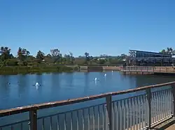Lake Allambee is an artificial lake in The Glades. The name 'Lake Allambee' comes from an Aboriginal language in Victoria and means "to sit" or "to remain a while".[35] In 2018, a project was undertaken to eradicate invasive fish species from the lake. On 15 June 2021, rotenone was used to eradicate Pearl Chichlid and Mosquitofish from the water.[36]