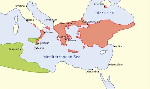 Malta suffers from a lack of attention in Byzantine sources, translating into a long-lasting perception amongst historians that the archipelago lay at the margins of the strategic, political and military interests of the Byzantine Empire.[8] This view was only overturned in recent years, following advances in Maltese archaeology.[9] Analysis of ceramics found that the Byzantines still sent navies into the Western Mediterranean well into the 9th century - confirming that Malta was a strategic stepping stone in the defence system around North Africa, Sicily and the Balearics.[8] Although occasionally raided by Arabs naval forces, Malta - together with Sardinia and the Balearics - provided the Byzantines with a good strategic base in the central and western Mediterranean, enabling them to maintain an economic and military presence.[10]