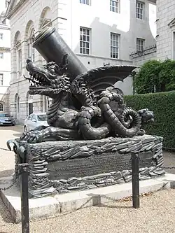 After the siege was lifted, the Spanish Regency presented one of the captured French mortars to Rear Admiral Arthur Kaye Legge. They requested that it might be placed in one of London's Royal Parks to commemorate the victory at Salamanca, the liberation of southern Spain and the exploits of the Duke of Wellington.[5] The Prince Regent agreed and instructed the Earl of Mulgrave to procure a suitable carriage for the mortar and set it up in Horse Guards Parade. The royal carriage department at the Royal Arsenal, Woolwich, carried out the work, creating an elaborate allegorically sculpted bronze base for the weapon. It was unveiled on the Prince Regent's 54th birthday, situated on the south side of the parade ground behind a square of chevaux de frise.[5] It was subsequently moved to its present position adjacent to the Horse Guards building.