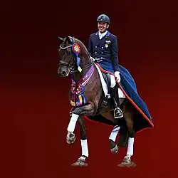 Parra is originally from Colombia and a dentist by profession.[15] Parra began training in Germany in after meeting Linda Zang in 1995, who recognized his talent.[15] Since turning his attention to dressage full time, he has competed and medaled in international competitions including the Pan American Games, Central American Games, World Cup finals, World Equestrian Games and the Olympics. Parra has medaled at the Bolivarian Games, the Central American Games, and the 1998 Pan American Games for his native country, Colombia. Riding for Colombia, he participated in the 2004 Olympic Games, in Athens and the 2005 FEI World Cup Finals, in Las Vegas. He competed twice at the World Equestrian games, in Jerez 2002 and Aachen 2006.