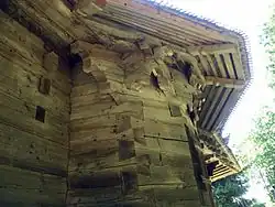 As it was remarked by others, the most distinctive feature of this construction is the plan with its lateral apses. The entrance of the church was placed on the south and its threshold is the long southern ground sill, laid first over the stones of the foundation. The western part of the narthex ends polygonal, with three short walls. At the opposite side, the sanctuary has also a polygonal shape with five outer walls. In the middle it is the nave, enlarged on both lateral sides by two polygonal apses, also with five short outer walls. Behind the iconostasis, on both sides of the sanctuary, but unobserved from outside, there are two rectangular pockets like rooms used as prothesis and diaconicon. In Moldavia, Ioana Cristache-Panait mentioned about 30 wooden churches with a similar trefoil plan. The church was built 7 m wide for about 95 men and 75 women, which was a medium-sized parish at that time. Inside the nave there is a choir loft that much probably was built at the same time with the church, and there can about 45 children, young men and women attend the service, apart from their parents. As in the plan, the church continues to respect the Moldavian constructive tradition in the lower part of its elevation. The lower walls were erected 3.7 m high, higher than the half of the width of the church. The uppermost timbers end outside the wall with cantilevers to support the eaves purlins of the lower roof. These cantilevers, high above the ground and shaped with numerous stylised heads of horses, arc very specific for Moldavia. The same can be said about the dimensions and the design of the portals, windows and openings in the wall between men and women. The consoles inside the nave and sanctuary, and the cross beams supporting the flat ceiling over the narthex are all adorned with filigree like decoration. The large eaves formed by the long ends of the lower rafters and the typical continuous roof over the apses and all around the church complete the list of Moldavian features.