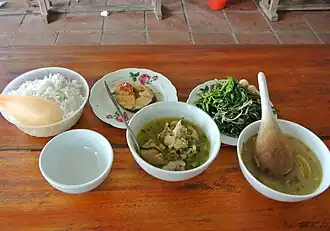 The meal almost always consists of a large helping of rice, boiled or pickle vegetables, soup, and some choices of meat.[1] Possible side dishes may include pork, beef, chicken, eggs, fish, grains, vegetables, tofu, soups, broths, etc. It is often eaten with chopsticks and a spoon.[2] As the name suggests, cơm bình dân is typically inexpensive, making it affordable for the common Vietnamese.