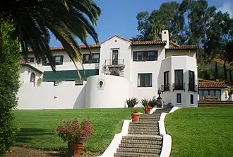 In 1922, C. E. Toberman hired architects Russell & Alpaugh to design his Mission Revival and Spanish Colonial Revival style dream house, which took two years to build and was completed in 1924.[3] The estate, built on a 2-acre (8,100 m2) lot, includes a 19-room, 9,800-square-foot (910 m2) main house, a 1,809-square-foot (168.1 m2) guest apartment and garage, and a separate natatorium with a 30 by 50-foot (15 m) tiled pool with cabanas under skylights.[3][4] The main house has eight fireplaces, a butler's pantry and cut-crystal doorknobs.[3] Toberman, who lived to be 101 years old, recalled in a 1981 interview that the estate became "practically a country club" with its enclosed swimming pool, tennis courts, a nine-hole pitch-and-putt golf course, and formal gardens.[3][5]
